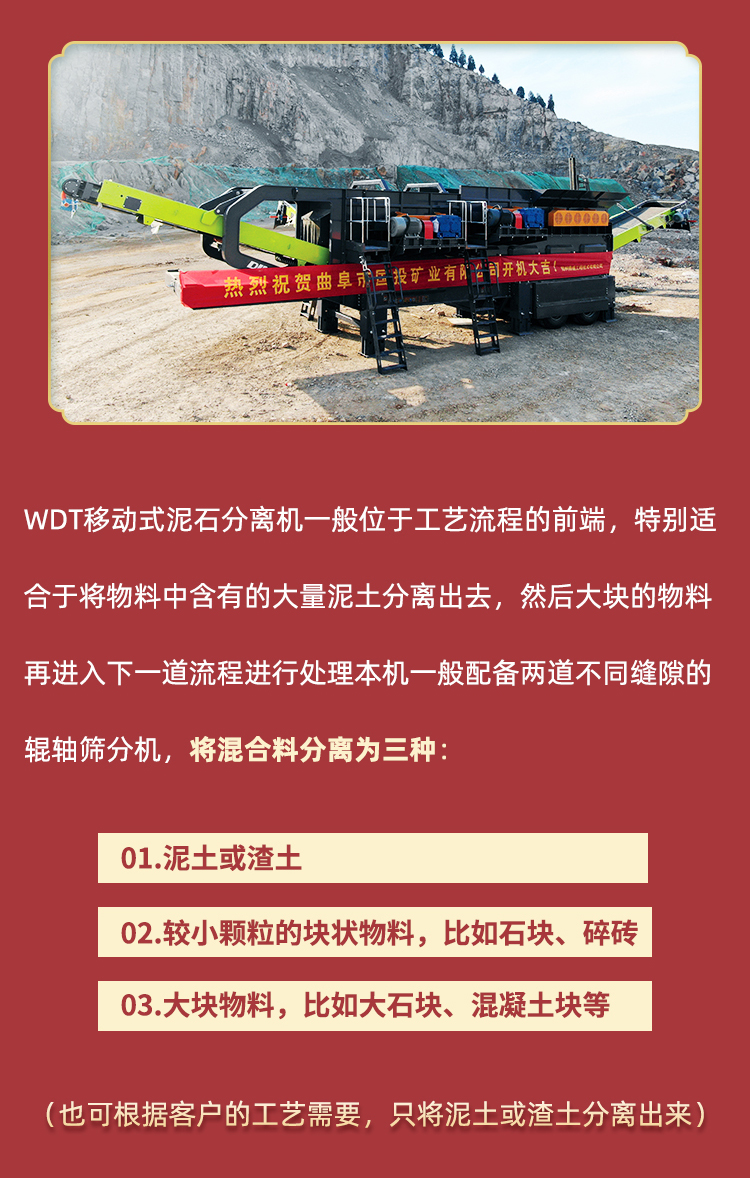 移動式泥石分離機是一種可將粘土等雜質與石材分離的設備,它可以很好地分離和篩選泥石。加工后的石材質地均勻、干凈、價格高,在建筑市場更受歡迎。只需要一臺粘土泥石分離機,離高品質砂石只有一步之遙!