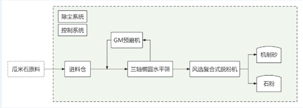 主用裝備:瓜米石低制粉全篩分制砂機、三軸圓水平篩、風選復合式脫粉機、除塵系統、控制系統