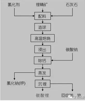 氯化焙燒法主要是采用氯化劑(氯化鈣)使鋰礦石中的鋰及其他有價金屬轉化為氯化物,分為中溫氯化和高溫氯化兩種工藝。