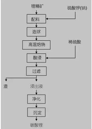 硫酸鹽法常用于處理硅酸鹽礦物,但用于鋰礦石提取鋰時,需要經過鋰礦石與硫酸鉀(鈉)混合配料、造球、高溫焙燒,將礦石中的鋰置換成可溶性的硫酸鋰,經稀硫酸浸出,浸出液經凈化、沉淀獲得碳酸鋰。