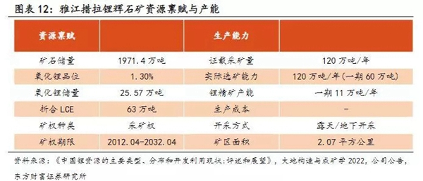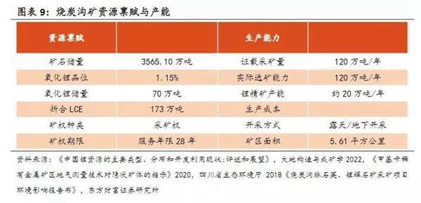 產能:燒炭溝礦區采用露天及地下兩種開采方式,證載采礦量為120萬噸每年,其中鋰精礦產能約為20萬噸每年。