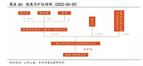 礦權歸屬:燒炭溝鋰輝石礦的采礦權由天齊鋰業子公司雅江潤豐所有。該燒炭溝采礦權為雅江縣潤豐礦業所有,潤豐礦業為天齊鋰業控股子公司,天齊對其持股比例53.15%,蔣衛民持股24.79%,其他股東持股合計22.06%。