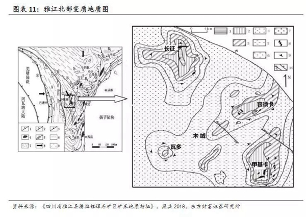 四川鋰輝石礦分布集中,平均品位約1.30%-1.42%,主要分布在馬爾康、金川、康定、雅江、道孚等縣。花崗偉晶巖型鋰礦主要分布在新疆阿爾泰成礦帶、川西松潘–甘孜成礦帶,典型礦床為新疆北部阿爾泰的可可托海鋰多金屬礦床、新疆西南部的大紅柳灘鋰多金屬礦床及川西甲基卡鋰鈹鈮鉭銣礦床等。川西一帶偉晶巖型鋰礦主要發育于松潘-甘孜造山帶東緣,其包含甲基卡、馬爾康、黨壩、扎烏龍等礦床,形成了四川典型的金川-馬爾康成礦區和康定-道孚成礦區,代表鋰礦有“甲基卡礦田”和“可爾因礦田”,該區鋰礦都產于花崗偉晶巖脈中,成礦母巖為二云母花崗巖。花崗偉晶巖脈為鋰礦的賦存和載體,脈體受構造、地層等的控制,鋰礦脈3~450 m不等,平均30~50 m,厚度3~21m不等,平均約3~5m,資源儲量豐富。