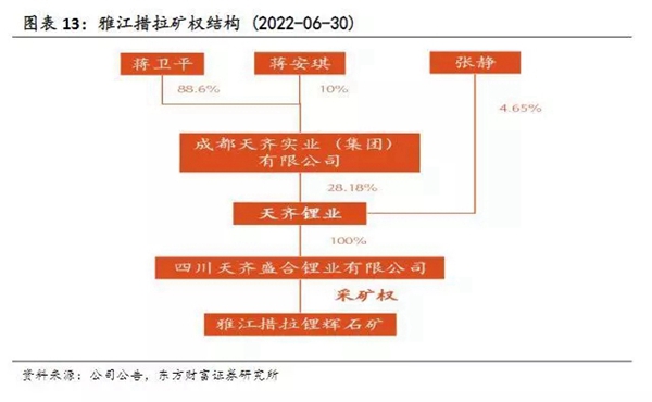 礦權歸屬:雅江措拉鋰礦采礦權屬于天齊鋰業,實控人為蔣衛平。雅江措拉鋰礦采礦權為天齊盛合(天齊鋰業子公司)所有,實控人蔣衛平及其一致行動人通過天齊集團持有上市公司天齊鋰業28.18%股權,另外蔣衛平之妻張靜亦直接持有天齊鋰業4.65%股權,兩者持有權益合計約33%。