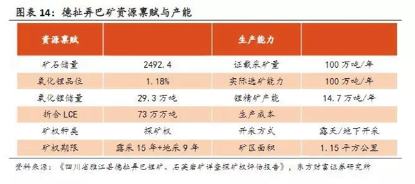 資源稟賦:根據云南陸緣衡礦業權評估有限公司出具的《四川省雅江縣德扯弄巴鋰礦、石英巖礦詳查探礦權評估報告》,德扯弄巴鋰礦的礦石資源儲量2492.4萬噸,氧化鋰品位1.18%,折合Li2O資源儲量約29.3萬噸,折合碳酸鋰當量72.4萬噸,屬于特大型鋰礦。