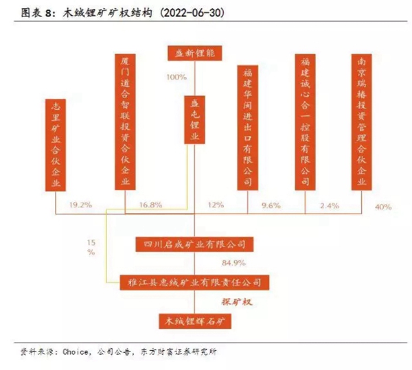 礦權歸屬:木絨鋰礦探礦權歸屬于雅江惠絨,尚未開采投產。據盛新鋰能21年報披露,木絨鋰礦尚處于勘探階段,并無采礦權,該礦山項目的儲量報告正在編制中,后續惠絨礦業將適時推進探轉采的相關工作。雅江惠絨為四川啟成礦業有限公司的控股,啟成礦業持股84.9%,而啟成礦業股權由多方組成,較為分散。