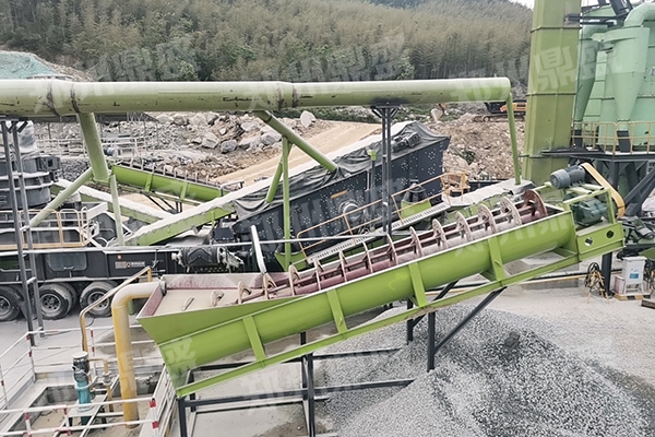鄭州鼎盛在湖南建設的時產(chǎn)150噸花崗巖制砂生產(chǎn)線包括了給料、破碎、制砂、洗砂等模塊,其中洗砂模塊采用的XL螺旋式洗砂機。
