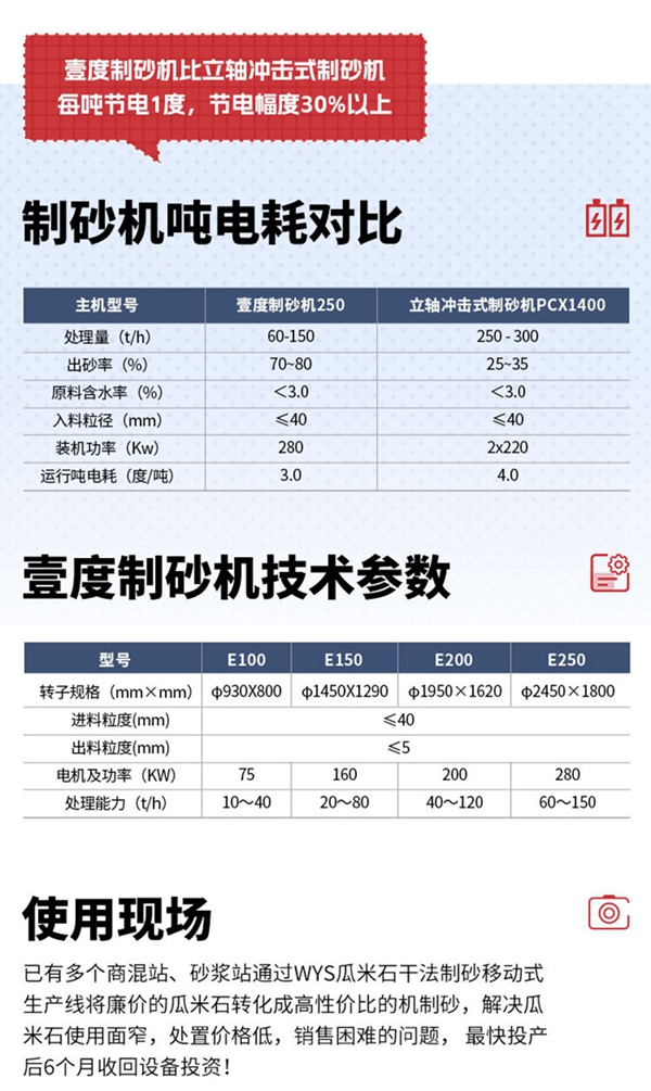 瓜米石制砂專用制砂機(壹度制砂機)與市面上傳統的沖擊式制砂機的區別主要是成砂率、顆粒級配、含粉量以及用電量。