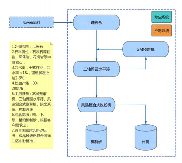 瓜米石俗稱為石沫,顆粒大小與綠豆相似,是一種碎石料,又稱為石粉、豆石,因品相與瓜子片相像,顆粒小而又常見于針片狀存在,所以限制了其的使用領域,給骨料銷售帶來困難,時常于低價格或者廢棄料處置。為幫助客戶解決瓜米石使用面窄,處置價格低,銷售困難的問題,鼎盛公司抓住客戶困境重視客戶體驗,并根據(jù)瓜米石顆粒粒度小,再處置破碎困難,處置成本高,細篩分困難等的特性,且在干法作業(yè)與濕法作業(yè)的選擇中,選擇干法脫粉保證生產(chǎn)工況,通過一系列設備改良,工藝優(yōu)化組合,推出瓜米石專用干法制砂系統(tǒng),逐步解決上述問題,將低價格的廢棄瓜米石,一舉成功轉化成高性價比的人工機制砂。