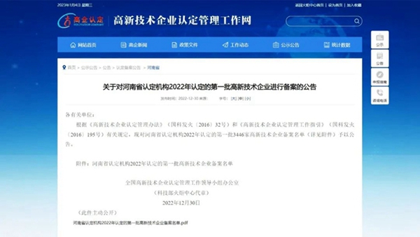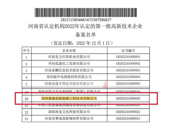 2022年12月30日,全國高新技術企業認定管理工作領導小組辦公室,公布了《河南省認定機構2022年認定的第一批高新技術企業備案公告名單》。鄭州鼎盛高新能源工程技術有限公司(以下簡稱“鄭州鼎盛”)名列其中,順利通過“國家高新技術企業”復審認定。