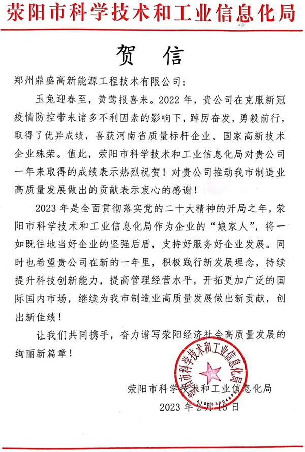2月15日,滎陽市科學技術和工業信息化局向鄭州鼎盛高新能源工程技術有限公司(以下簡稱“鄭州鼎盛”)發來賀信。向公司過去一年取得優異成績表示祝賀,恭賀鄭州鼎盛喜獲河南省質量標桿企業、國家高新技術企業等殊榮。對鄭州鼎盛推動滎陽市制造業高質量發展做出的貢獻表示感謝。