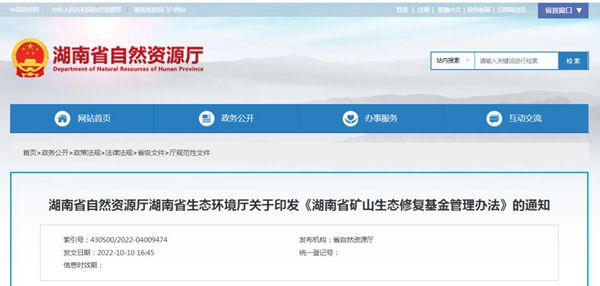 10月10日,湖南省自然資源廳、生態(tài)環(huán)境廳聯(lián)合印發(fā)《湖南省礦山生態(tài)修復基金管理辦法》(以下簡稱《辦法》)。