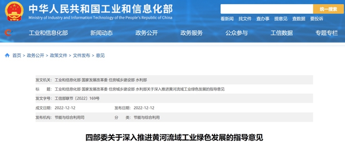 12月12日,工業和信息化部、國家發展改革委、住房城鄉建設部、水利部四部門聯合發布《關于深入推進黃河流域工業綠色發展的指導意見》,以下簡稱《意見》。